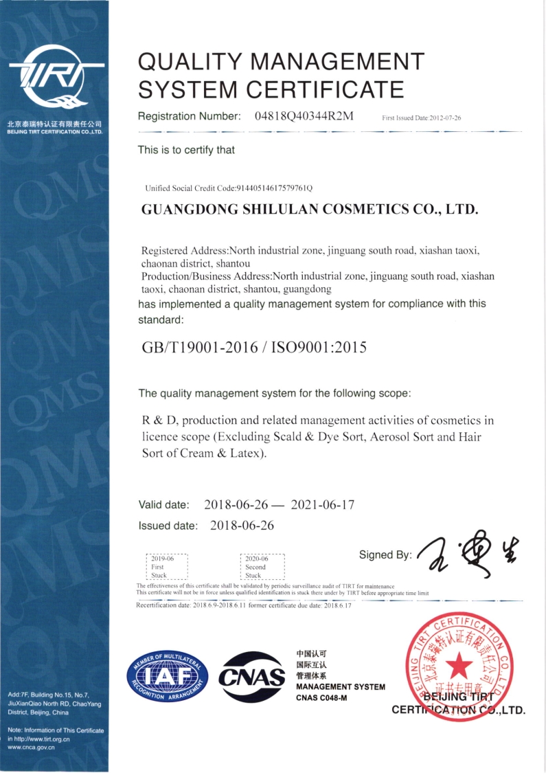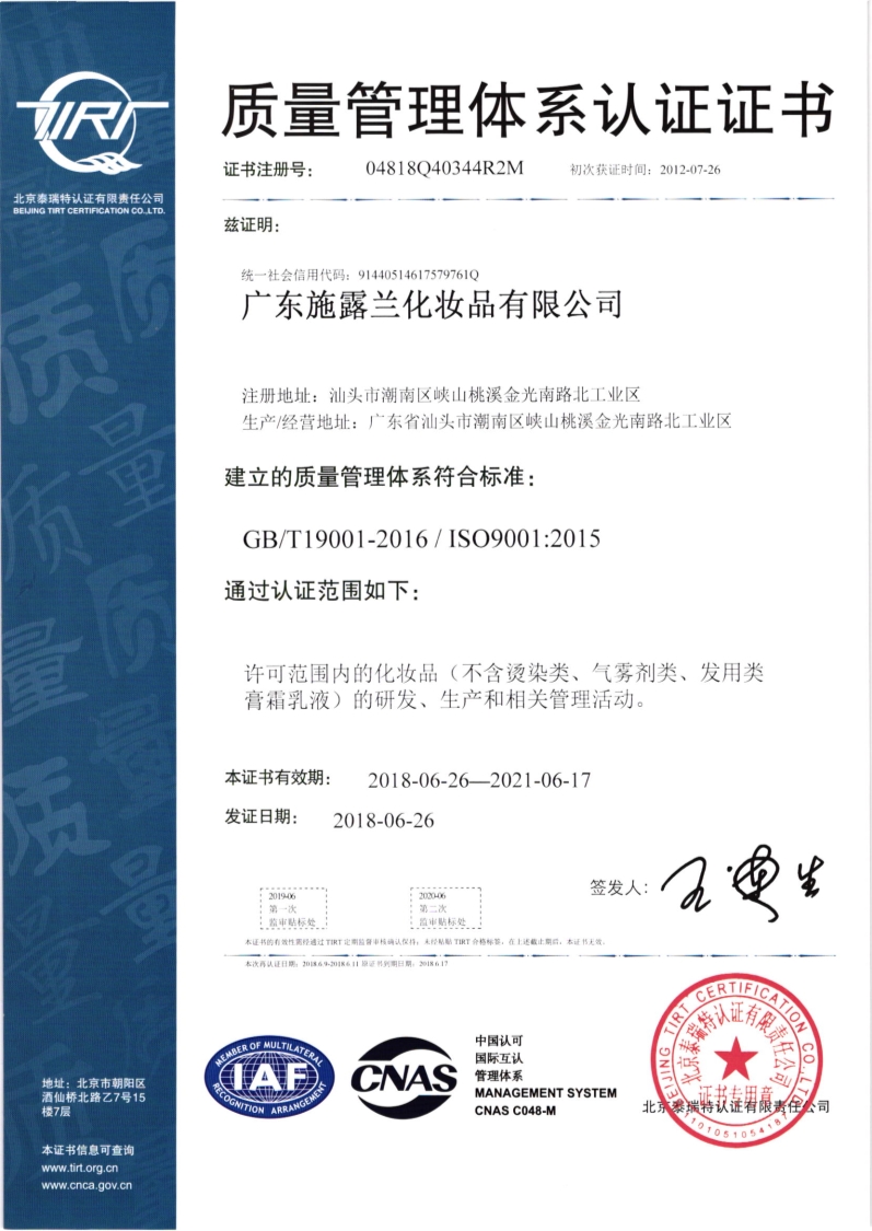 我司的ISO9001:2015版质量管理体系于2018年6月11日通过换版认证审核,并于2018年6月26日获得证书。